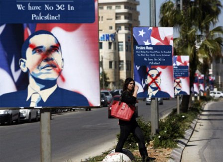 | Poster về chuyến thăm của Obama tại thủ đô Ramalah bị gạch xóa (Ảnh AP) |