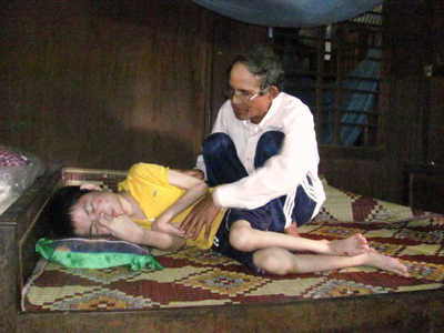Người cha già hàng ngày phải chăm sóc con bị di chứng do chất độc màu da cam. Ảnh: V.LONG