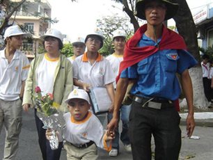 Anh Nguyễn Tuấn Linh (áo xanh) - người đi bộ xuyên Việt đòi công lý cho nạn nhân chất độc da cam
