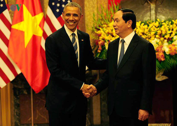 | Tổng thống Barack Obama (trái) và Chủ tịch Trần Đại Quang tại Phủ Chủ tịch hôm 23/5. Ảnh: Ngọc Thành/VOV. |