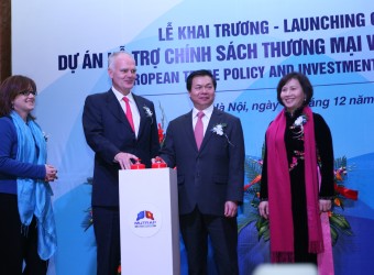 | Bộ trưởng Vũ Huy Hoàng và Đại sứ Trưởng Phái đoàn EU tại VN, Ngài Franz Jessen bấm nút khai trương dự án Hỗ trợ Chính sách Thương mại và Đầu tư của châu Âu |