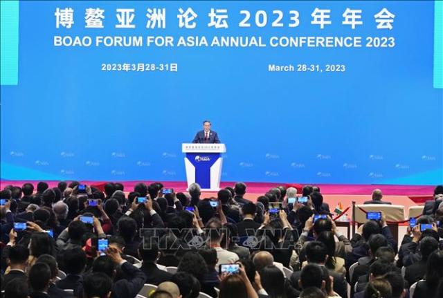 Hội nghị thường niên Diễn đàn châu Á Bác Ngao (BFA) năm 2023 khai mạc tại Trung tâm Hội nghị Quốc tế ở Bác Ngao, tỉnh Hải Nam, Trung Quốc với chủ đề “Một thế giới không chắc chắn: Đoàn kết và hợp tác để phát triển giữa những thách thức”. Ảnh: Kyodo/ TTXVN |