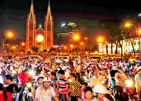 | Người dân TPHCM vui Giáng sinh tại khu vực Nhà thờ Đức Bà. Ảnh: VIỆT DŨNG |