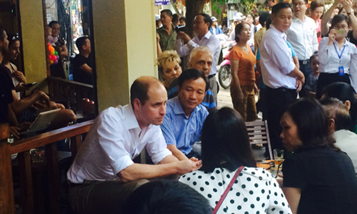 | Hoàng tử Anh William chiều nay đến quán cà phê Aha trên phố Thuốc Bắc, Hà Nội để gặp các chuyên gia y học cổ truyền, người nổi tiếng và đại diện các tổ chức phi chính phủ trong khuôn khổ chuyến thăm đầu tiên kéo dài hai ngày tới Việt Nam (Ảnh: Vnexpress). |