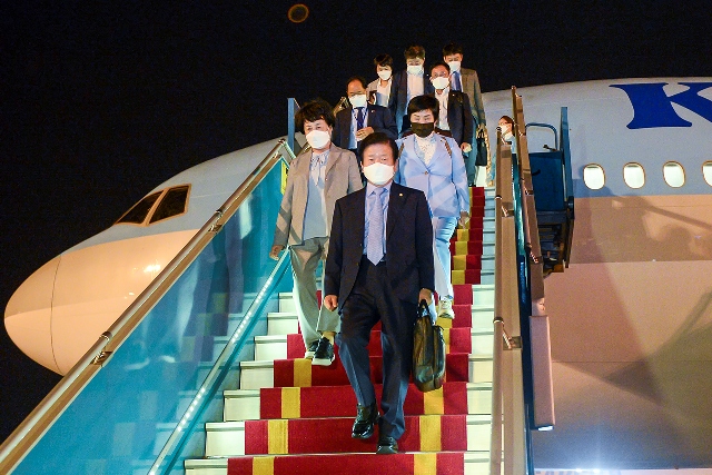 Đoàn đại biểu cấp cao Quốc hội Hàn Quốc do Chủ tịch Quốc hội Hàn Quốc Park Byeong-Seug dẫn đầu đến Hà Nội, bắt đầu chuyến thăm chính thức Việt Nam. -Ảnh: quochoi.vn |