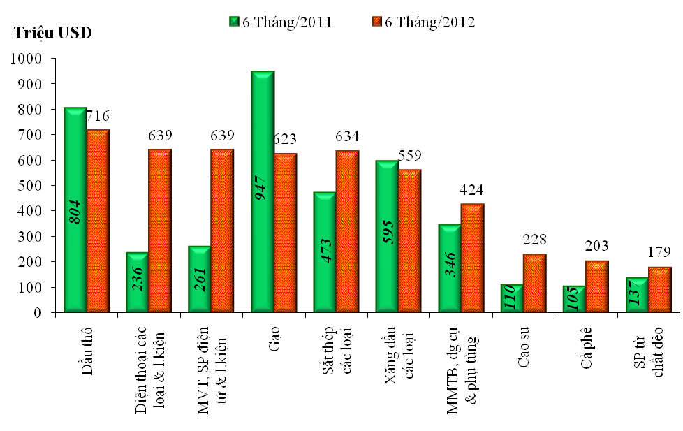 | Kim ngạch xuất khẩu một số nhóm hàng chính của Việt Nam sang thị trường ASEAN 6 tháng năm 2011 và 6 tháng năm 2012 -Nguồn: Tổng cục Hải quan. |