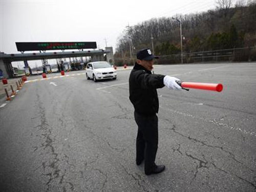 | Một nhân viên an ninh Hàn Quốc điều khiển giao thông tại chốt chặn gần công nghiệp Kaesong. Ảnh: REUTERS |