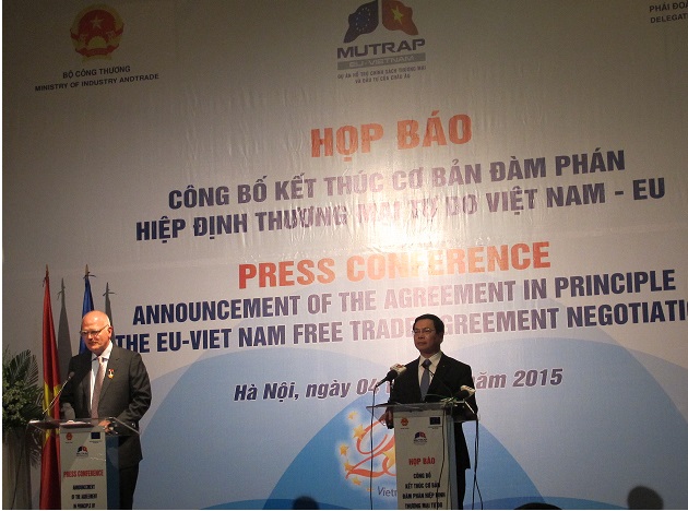 Ngày 26/06/2012, vòng đàm phán Hiệp định Thương mại tự do giữa Việt Nam và Liên minh châu Âu (EVFTA) chính thức khởi động. Với tinh thần đàm phán tích cực, linh hoạt của cả EU và Việt Nam, các vòng đàm phán đã có bước tiến triển nhanh. Sau phiên đàm phán lần thứ 14 diễn ra trong các ngày 13 và 14/07/2015, Bộ trưởng Bộ Công thương Việt Nam Vũ Huy Hoàng và Cao ủy Thương mại EU Cecilia Malmstrom thống nhất kết thúc cơ bản đàm phán Hiệp định thương mại tự do giữa Việt Nam và EU (FTA). FTA là một trong những Hiệp định có chất lượng cao nhất của Việt Nam và EU, dự kiến đem lại lợi ích tối ưu cho người dân, doanh nghiệp 2 bên.