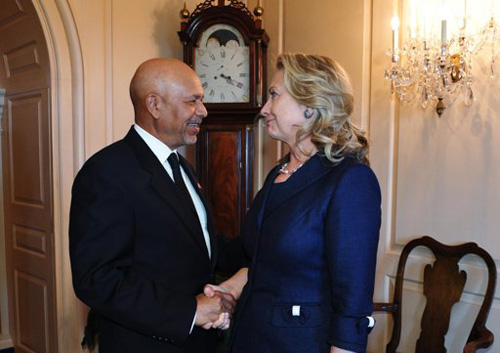 Ngoại trưởng Mỹ Hillary Clinton bắt tay Đại sứ Libya Ali Suleiman Aujali, tại Bộ Ngoại giao ở Washington ngày 12/9 (Ảnh: Reuters)