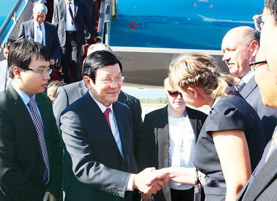 Quang cảnh đón Chủ tịch nước Trương Tấn Sang tại sân bay Kneviche, Vladivostok.