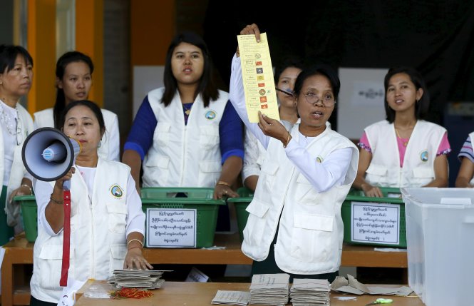 | Nhân viên giám sát bầu cử giơ một lá phiếu bầu tại điểm bầu cử Mandalay, Myanmar ngày 8-11 (Ảnh: Reuters) |