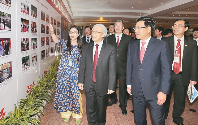 | Tổng Bí thư Nguyễn Phú Trọng và các đại biểu xem một số hình ảnh về thành tựu đối ngoại của Việt Nam. Ảnh: TRÍ DŨNG (TTXVN) |