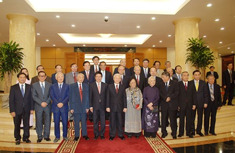 Tổng Bí thư Nguyễn Phú Trọng và các vị đại biểu đại diện các thế hệ cán bộ của ngành Ngoại giao.