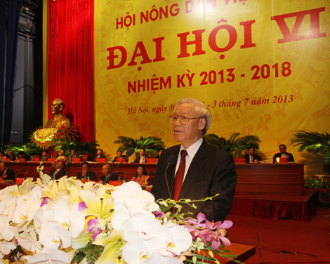 Phát biểu tại Đại Hội, Tổng Bí thư Ban chấp hành Trung ương Đảng Cộng sản Việt Nam Nguyễn Phú Trọng cho rằng Hội nông dân nhiệm kỳ 2013-2018 có vai trò quan trọng để xây dựng giai cấp nông dân trong thời kỳ đẩy mạnh công nghiệp hóa, hiện đại hóa và hội nhập quốc tế. Do đó cần phát huy vai trò của Hội Nông dân để bảo vệ quyền và lợi ích hợp pháp của người nông dân trong kinh tế thị trường…Tổng Bí thư Nguyễn Phú Trọng nêu rõ: Nghị quyết Đại hội XI, Nghị quyết Trung ương lần thứ 7 (khóa X) về “Nông nghiệp, nông dân, nông thôn”, Nhà nước sẽ tăng đầu tư vốn, có biện pháp bảo vệ thị trường nội địa, phát triển thị trường xuất khẩu nông sản…nhằm cải thiện đời sống người nông dân, góp phần thúc đẩy nên kinh tế Việt Nam ngày càng ổn định, phát triển: “Một trong những vấn đề lớn của liên minh công nhân – nông dân – trí thức là liên minh về kinh tế làm nền tảng cho liên minh chính trị. Việc trao đổi hàng hóa giữa công nghiệp và nông nghiệp, giữa nông thôn và thành thị là hình thức liên kết kinh tế có tác dụng kích thích mạnh mẽ nông dân sản xuất, kết nối thị trường, hợp tác lao động và ứng dụng tiến bộ khoa học kỹ thuật để đạt năng suất - chất lượng - hiệu quả. Hội Nông dân phải coi đây là khâu quan trọng để hướng dẫn nông dân tổ chức sản xuất, chế biến và tiêu thụ sản phẩm. Hội phải có quyết tâm cao, biện pháp tốt dẫn dắt nông dân sản xuất, kinh doanh giỏi.”
