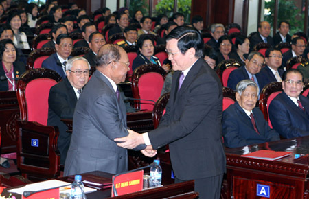 | Chủ tịch nước Trương Tấn Sang và Chủ tịch Quốc hội Campuchia Samdech Heng Samrin tại lễ mít tinh. Ảnh:baomoi.com |