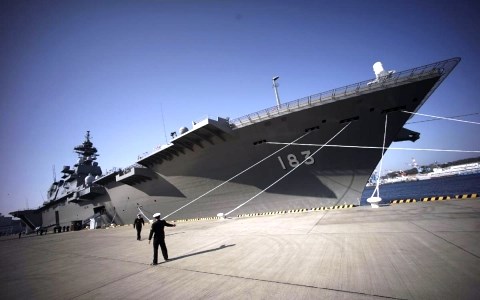| Khu trục hạm Izumo của Nhật Bản đậu tại cảng Yokosuka (Ảnh AP) |