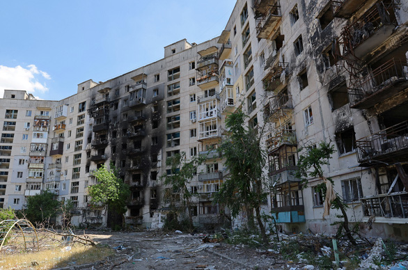 Một tòa nhà bị hư hại nặng trong chiến sự Nga - Ukraine ở thành phố Sievierodonetsk, tỉnh Lugansk ngày 1/7. Ảnh: Reuters |