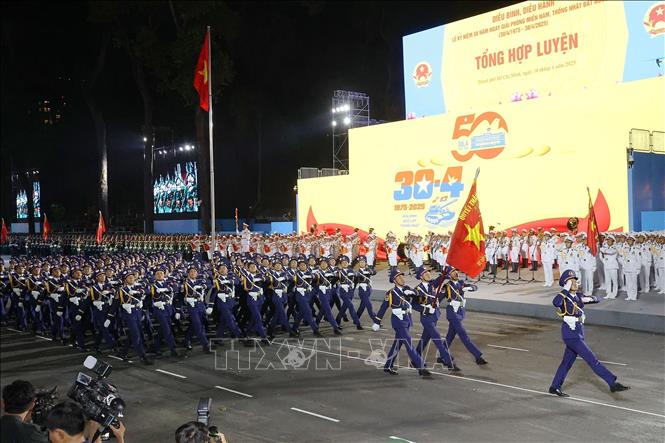 Lực lượng 5 cánh quân tham gia Tổng hợp luyện diễu binh, diễu hành tối 18/4/2025. Ảnh: Anh Tuấn/TTXVN |