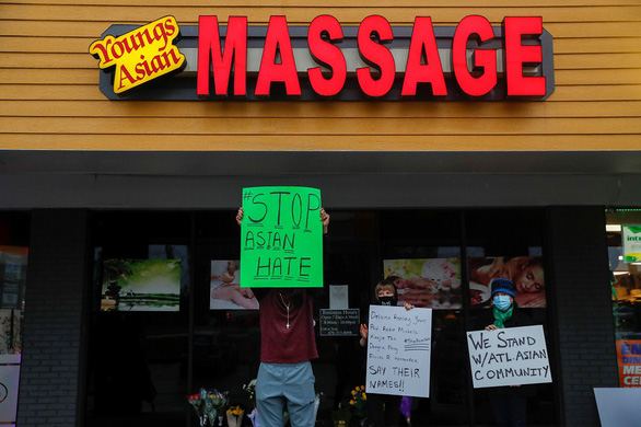 Người dân giơ các biểu ngữ phản đối thù hận nhằm vào người gốc Á tại Atlanta. Ảnh AP |
