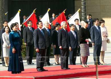 Nhà vua Nhật Bản và Hoàng hậu đón Chủ tịch nước Trương Tấn Sang và Phu nhân tại Hoàng cung