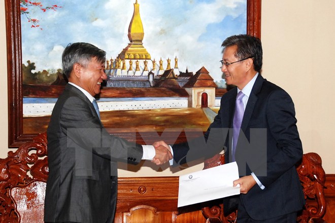 | Đại sứ Nguyễn Mạnh Hùng (trái) trao Điện mừng của Ban Chấp hành TW Đảng Cộng sản Việt Nam gửi tới Ban Chấp hành TW Đảng NDCM Lào cho Phó Trưởng ban Đối ngoại Trung ương Đảng NDCM Lào, Thongsavan Phomvihan.(Ảnh: TTXVN) |