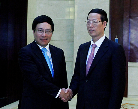 | Phó Thủ tướng, Bộ trưởng Ngoại giao Phạm Bình Minh và Phó Thủ tướng Trung Quốc Trương Cao Lệ gặp gỡ bên lề CAEXPO và CABIS lần thứ 11 tại Nam Ninh, Trung Quốc - Ảnh: VGP/Hải Minh |