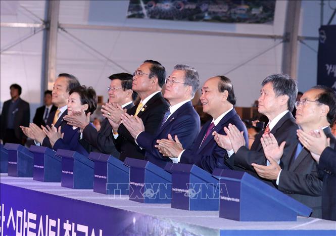 Tổng thư ký ASEAN Lim Jock Hoi, Thủ tướng Chính phủ Nguyễn Xuân Phúc, Tổng thống Hàn Quốc Moon Jae-in, Thủ tướng Thái Lan Prayut Chan-o-cha, Thủ tướng Lào Thongloun Sisoulith và các đại biểu thực hiện nghi thức động thổ Thành phố Thông minh Busan Eco-Delta, chiều 24/11/2019 (theo giờ địa phương), tại thành phố Busan, Hàn Quốc - Ảnh: Thống Nhất/TTXVN |