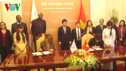 | Phó Thủ tướng Phạm Bình Minh và Tổng Thư ký Abdou Diouf chứng kiến Lễ ký Bản ghi nhớ về việc Tổ chức Quốc tế Pháp ngữ hỗ trợ Trung tâm Nghiên cứu và hợp tác Pháp ngữ ở khu vực Châu Á-Thái Bình Dương ngày 13/3/2014 - Ảnh: Văn Anh |