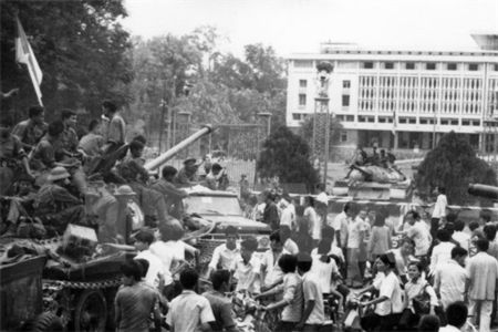 | Xe tăng quân giải phóng tiến vào dinh Độc Lập trưa ngày 30-4-1975. Ảnh: Trần Mai Hưởng - TTXVN |