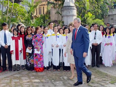 TT Bush cùng phu nhân tại nhà thờ cửa Bắc, Hà Nội. Ảnh : TTXVN