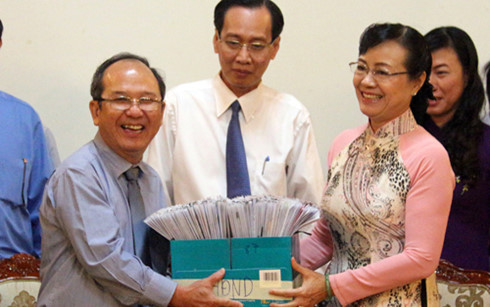 | Chủ tịch Ủy ban bầu cử Thành phố Hồ Chí Minh trao hồ sơ ứng cử đại biểu Quốc hội khóa XIV và đại biểu HĐND thành phố 2016-2021 cho Ủy ban MTTQ Việt Nam Thành phố sau gần một tháng tổ chức nhận hồ sơ ứng cử (Ảnh: vov.vn) |