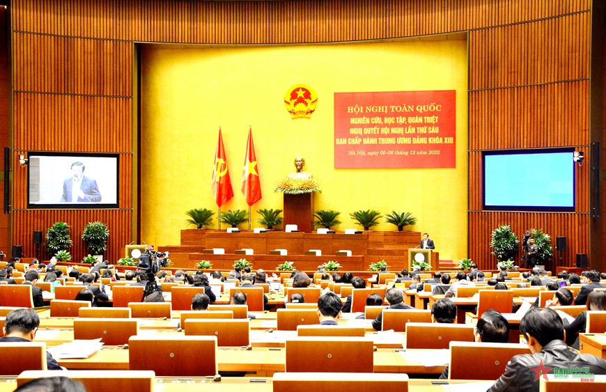 Hội nghị toàn quốc nghiên cứu, học tập, quán triệt Nghị quyết Hội nghị lần thứ 6, Ban Chấp hành Trung ương Đảng khóa XIII diễn ra trong 2 ngày (5 - 6/12), bằng hình thức trực tiếp kết hợp với trực tuyến. Hội nghị được kết nối tới hơn 11.600 điểm cầu, với trên 1.190.000 cán bộ, đảng viên tham dự.