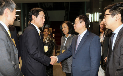 | Phó Thủ tướng Vương Đình Huệ chào đón lãnh đạo các tập đoàn công nghiệp, công nghệ thông tin, tài chính đa quốc gia hàng đầu châu Á (ảnh: Dân Trí) |
