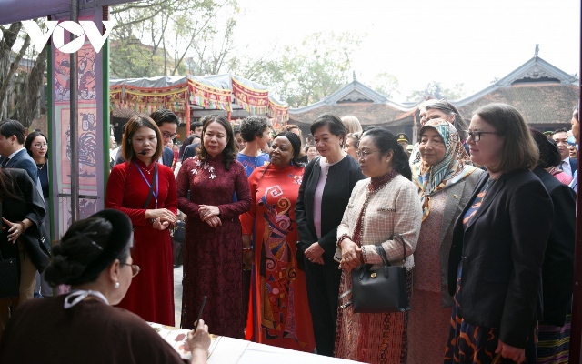Phó Chủ tịch nước Võ Thị Ánh Xuân và các nữ Đại sứ, Trưởng đại diện các tổ chức quốc tế tại Việt Nam tham quan gian hàng làm tranh Đông Hồ tại sân Đình Đồng Kỵ (Bắc Ninh). Ảnh: VOV |