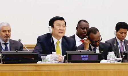 Trong phát biểu tại Hội nghị Thượng đỉnh Liên hợp quốc, Chủ tịch nước Trương Tấn Sang khẳng định Việt Nam đang nỗ lực cùng các nước ASEAN và các nước liên quan duy trì và củng cố hòa bình, an ninh trong khu vực nhằm tạo môi trường thuận lợi cho phát triển bền vững, trong đó có an ninh, an toàn và tự do hàng hải, hàng không trên Biển Đông, con đường huyết mạch kết nối ASEAN với các nước và khu vực khác.Việt Nam kiên trì và nhất quán chủ trương giải quyết hòa bình các tranh chấp ở Biển Đông trên cơ sở tôn trọng Luật pháp quốc tế, trong đó có Công ước Luật Biển của Liên hợp quốc 1982, thực hiện nghiêm túc và đầy đủ Tuyên bố về ứng xử giữa các bên ở Biển Đông (DOC) và thúc đẩy sớm đạt được Bộ Quy tắc ứng xử ở Biển Đông (COC).