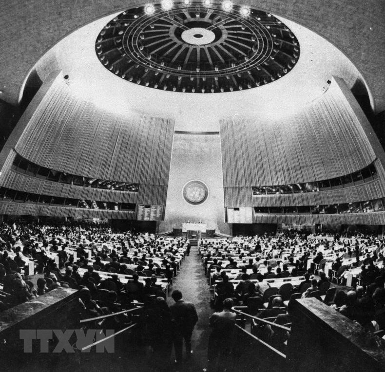 Ngày 20/9/1977, Phiên khai mạc Kỳ họp thứ 32 Đại hội đồng Liên hợp quốc tại New York (Mỹ) thông qua Nghị quyết công nhận Việt Nam là thành viên của Liên hợp quốc. Nguồn: TTXVN |