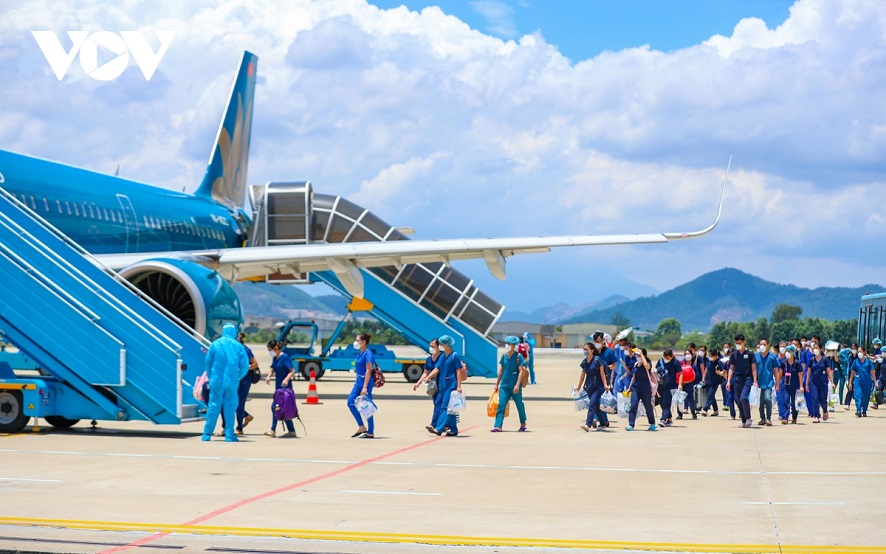 Gần 200 y bác sĩ thuộc các tỉnh miền Trung đã di chuyển trên chuyến bay số hiệu VN129 của Vietnam Airlines (ngày 27/8), khởi hành từ Đà Nẵng vào Thành phố HCM để hỗ trợ chống dịch cho các tỉnh thành phía Nam. Ảnh: VOV |