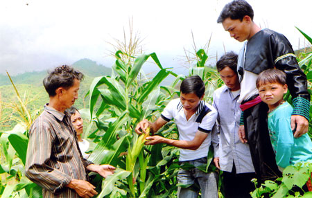 Cán bộ khuyến nông huyện Trạm Tấu (Yên Bái) hướng dẫn đồng bào Mông xã Tà Xi Láng cách chăm sóc ngô. Ảnh: Phương Thùy