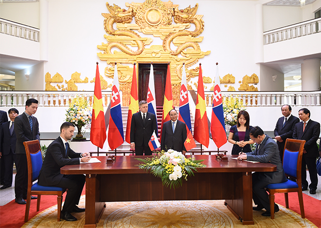 | Thủ tướng Nguyễn Xuân Phúc và Thủ tướng Slovakia Robert Fico chứng kiến lễ ký kết bản ghi nhớ về hợp tác toàn diện trong lĩnh vực giao thông vận tải giữa Bộ Giao thông vận tải Việt Nam và Bộ Giao thông và Phát triển vùng Slovakia - Ảnh: VGP/Quang Hiếu |