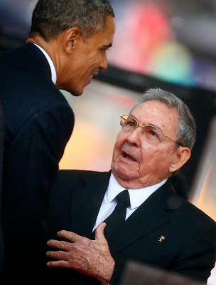 Ngày 10/12, tại lễ tưởng niệm trang nghiêm, trước gần 100 nguyên thủ quốc gia, khi bước lên bục phát biểu ca ngợi sự nghiệp và di sản của cố Tổng thống Nelson Mandela, ông B.Obama bất ngờ dừng lại để bắt tay Chủ tịch Cuba Raul Castro. Đáp lại, nhà lãnh đạo Cuba Castro cũng nhẹ nhàng mỉm cười và bắt tay ông B. Obama. Cử chỉ này của lãnh đạo hai quốc gia “thù địch” đã khiến dư luận quốc tế hết sức bất ngờ. Đây là cái bắt tay lịch sử thứ hai giữa các nhà lãnh đạo hai nước kể từ khi Cuộc cách mạng Cuba diễn ra vào năm 1960.