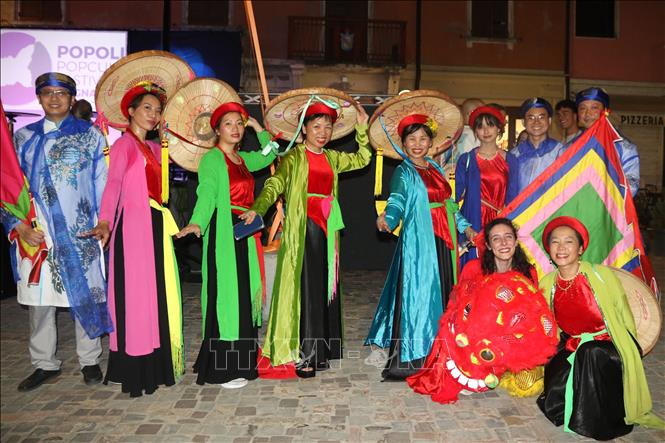 Các thành viên Hiệp hội nhịp cầu văn hóa Việt Nam - Italy tham gia lễ hội. Ảnh: Dương Hoa/Pv TTXVN tại Italy
