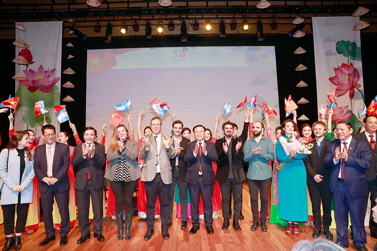 Chủ tịch Quốc hội Vương Đình Huệ với các nghệ sỹ tham gia biểu diễn chương trình chính trị nghệ thuật kỷ niệm 50 năm thiết lập quan hệ ngoại giao Việt Nam-Argentina. Ảnh: Doãn Tấn/TTXVN |