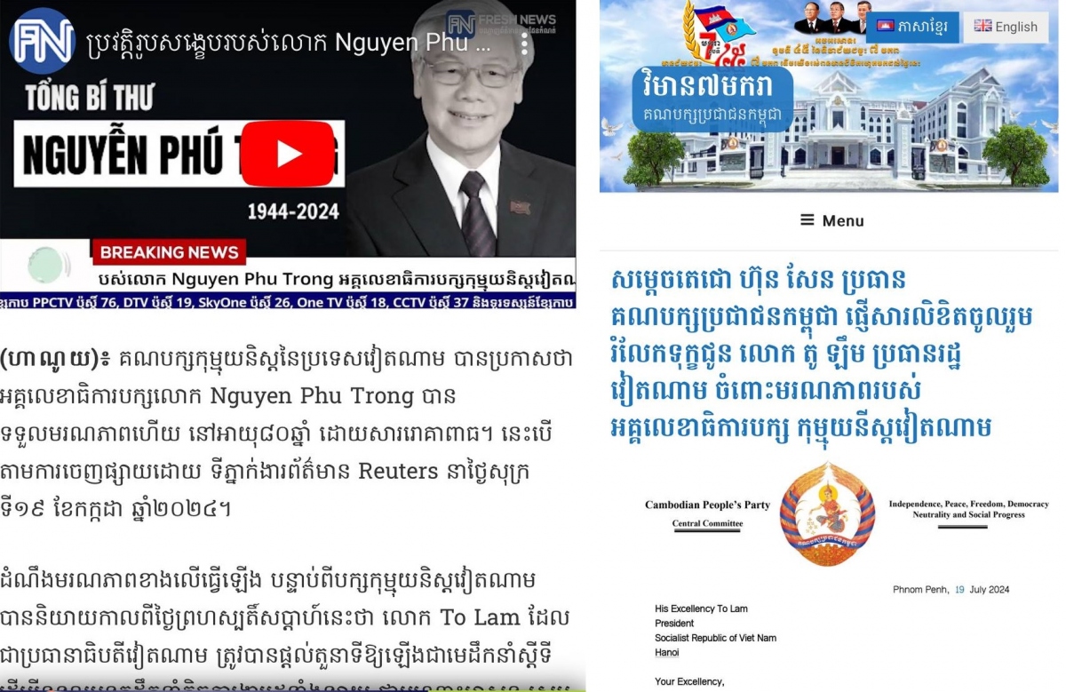 Sau khi Đảng, Nhà nước và Chính phủ Việt Nam công bố thông tin về việc Tổng Bí Thư Nguyễn Phú Trọng từ trần, nhiều tờ báo và hãng thông tấn hàng đầu tại Campuchia, như: Đài phát thanh quốc gia Campuchia, Đài truyền hình quốc gia Campuchia, Thông tấn xã Campuchia (AKP), báo điện tử Fresh News, báo Thmey Thmey, trang tin Dap News… đã đưa tin và tóm lược tiểu sử của Tổng Bí thư Nguyễn Phú Trọng.