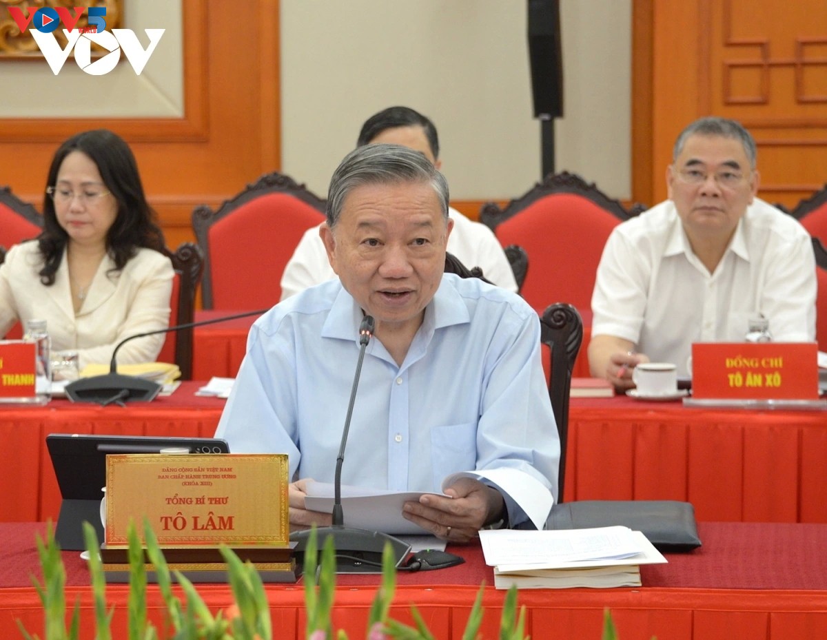 Tổng Bí thư Tô Lâm phát biểu tại cuộc làm việc. Ảnh: VOV |