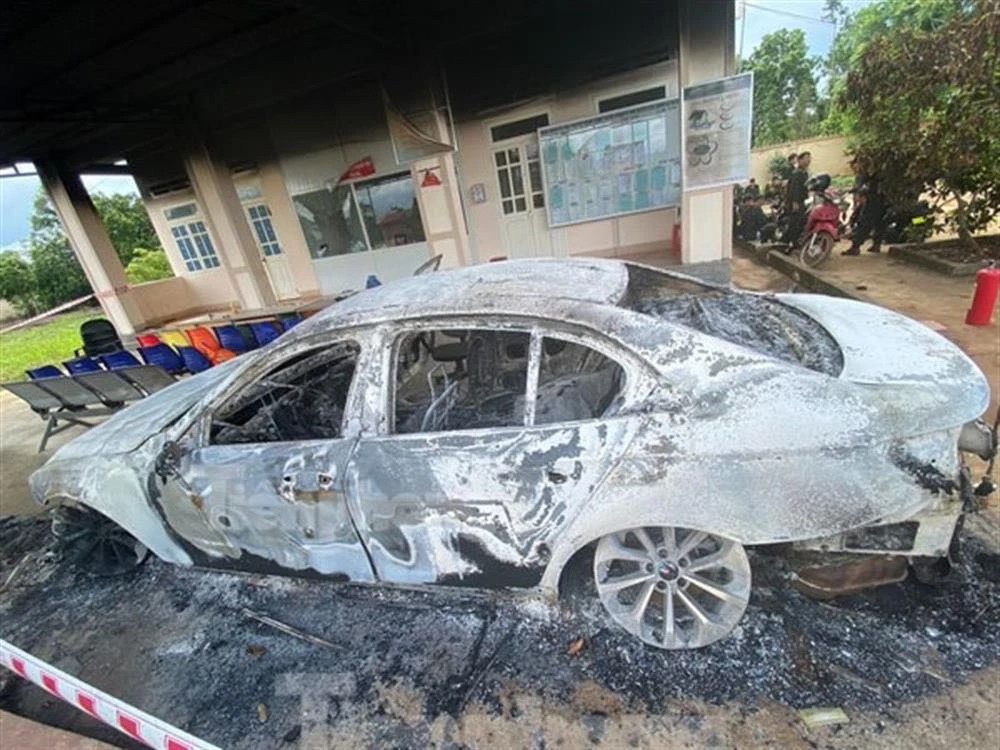Ô tô bị đốt cháy trong vụ khủng bố xảy ra ngày 11/6/2023 tại huyện Cư Kuin, tỉnh Đắk Lắk. Ảnh: Bộ Công an |