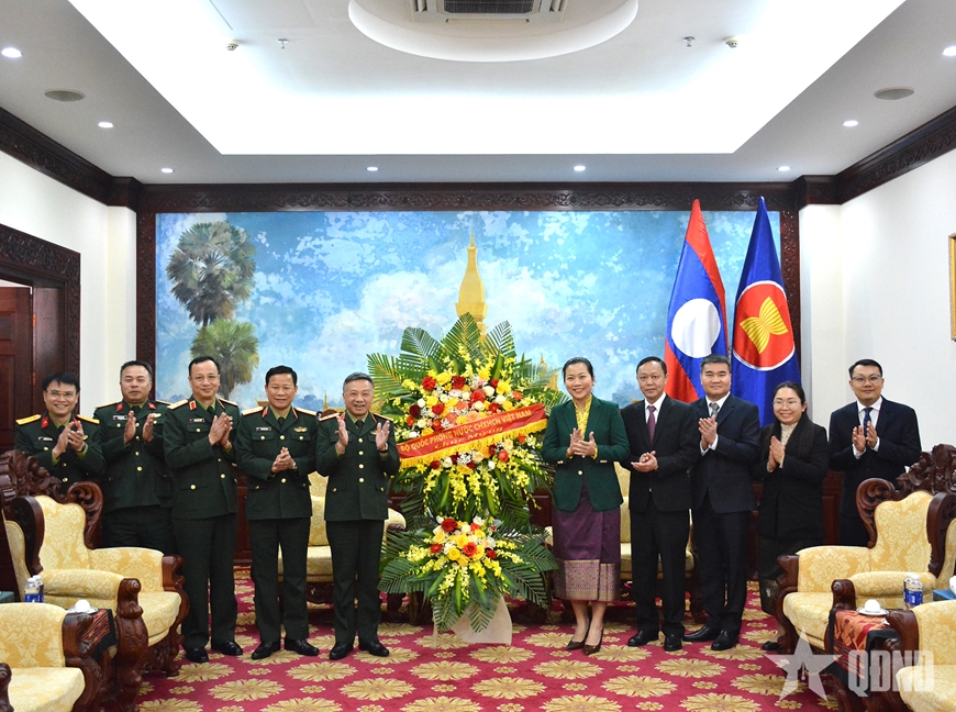 Đoàn đại biểu Bộ Quốc phòng Việt Nam chúc mừng nhân dịp kỷ niệm 70 năm Ngày thành lập Đảng Nhân dân Cách mạng Lào. Ảnh: qdnd.vn |