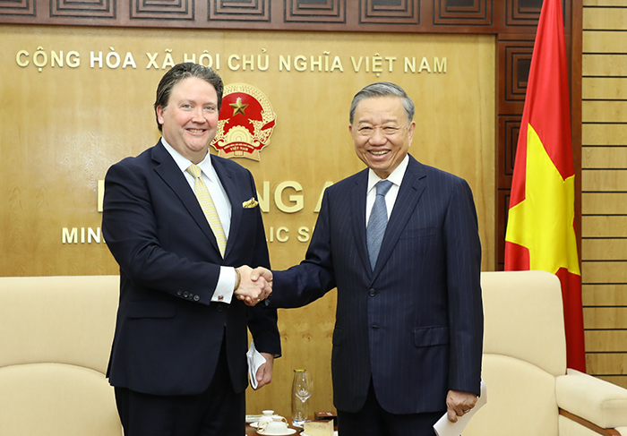 (VOV5) - Chiều nay (30/6), tại Hà Nội, phát biểu tại buổi tiếp Đại sứ đặc mệnh toàn quyền Hợp chúng quốc Hoa Kỳ tại Việt Nam Marc Knapper, Đại tướng Tô Lâm, Bộ trưởng Bộ Công an, nhấn mạnh quan hệ Việt Nam - Hoa Kỳ đang trên đà phát triển tích cực, đồng thời tái khẳng định thiện chí cũng như cam kết của Việt Nam nói chung và Bộ Công an Việt Nam nói riêng thúc đẩy hơn nữa quan hệ giữa hai nước.