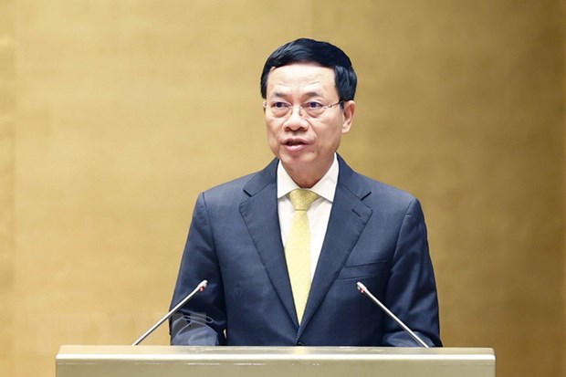 Bộ trưởng Thông tin và Truyền thông Nguyễn Mạnh Hùng trình bày Tờ trình về dự án Luật Giao dịch điện tử-sửa đổi. Ảnh: Doãn Tấn/TTXVN |