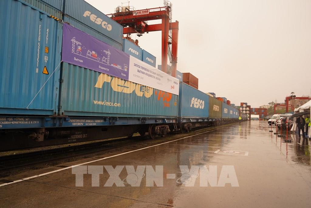 Sáng 6/9, tại Cảng biển Thương mại Vladivostok, LB Nga, diễn ra lễ kết nối tuyến vận tải đường biển chở hàng từ Việt Nam đến cảng Vladivostok với tuyến vận tải đường sắt từ cảng Vladivostok đến Moscow (LB Nga).