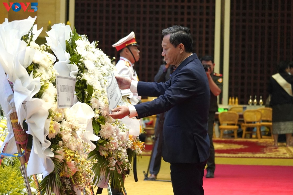 Đại sứ Nguyễn Minh Tâm dẫn đầu đoàn đại biểu Đại sứ quán, các cơ quan đại diện Việt Nam tại Lào và cộng đồng người Việt tại Lào đến viếng nguyên Chủ tịch Đảng Nhân dân cách mạng Lào, nguyên Chủ tịch nước CHDCND Lào Khamtay Siphandone. Ảnh: Trần Tuấn/VOV-Vientiane |